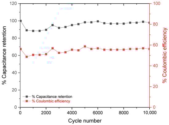 The cycle stability test of a supercapacitor device is of prime importance as it provides the ground information for the practical use of the device. An outstanding capacitance retention of about 97% was attained for the high-performance KOH-ADC electrode material after 10,000 cycles at a current density of 10 A/g (Figure 8). The high capacitance retention of this electrode material could be attributed to the superior structural advantages of KOH-ADC, i.e., the large mesopore volume that created easily accessible channels to the micropores as well as its ultra-large specific surface area and abundant open pores on the surface for EDL formation. In addition, the device showed a stable coulombic efficiency (~55%) for stable long-term operation. The KOH-ADC electrode material also possessed an energy density of 5.1 W h/kg and a power density of 97.6 W/kg, indicating an overall good electrode material for supercapacitor use.