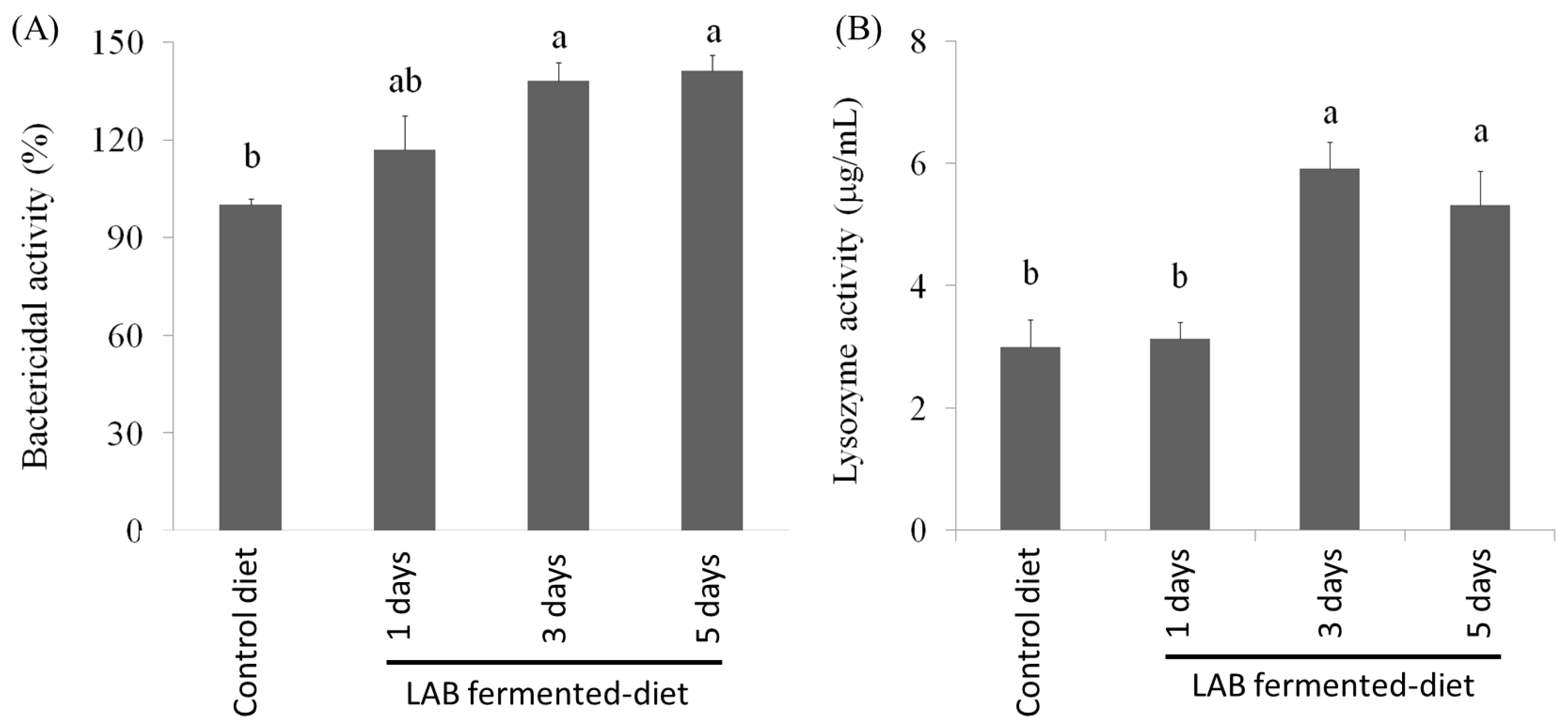 3.3. Effect of LAB-Fermented Feed on Immune Activity of O. fasciatus