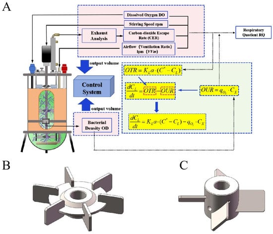 The fermentation control system (A) and types of stirring paddles for experimental fermenters (B) six straight-blade disc turbine-type stirring paddles, placed at the bottom; (C) inclined-blade paddle-type stirring paddles, placed in the middle.