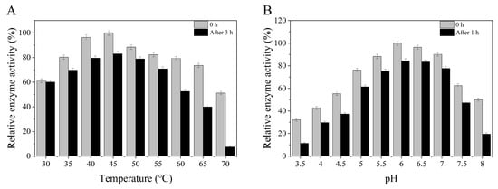 A method described by Sun et al. [], including modifications, was used to test the ACPase’s optimal temperature and thermal stability. The enzymatic activity was measured at 5 °C intervals from 30 to 70 °C. The activity at optimal temperature was defined as 100%, and relative activities at other temperatures were calculated. For thermal stability assessment, the enzyme was incubated at each temperature for 3 h, expressed as percentages relative to the initial activity, and relative activity was calculated to examine enzyme stability across temperatures.