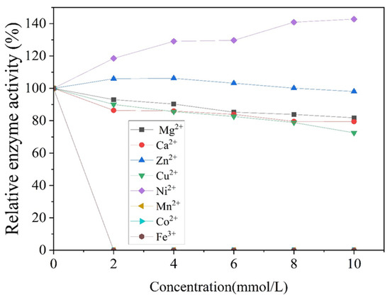 The effects of metal ions on ACPase activity were investigated. The reaction system contained various metal ions (Mg2+, Ca2+, Zn2+,Cu2+,Ni2+, Mn2+, Co2+, and Fe3+) at a final concentration of 10 mM. A reaction system without metal ions served as the control group. Enzyme activity was determined under optimal reaction conditions for both groups. The activity of the control group was defined as 100%.