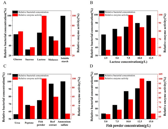 Carbon and nitrogen source optimization. (A) The effect of different carbon sources on the relative value of bacterial concentration and relative enzyme activity of bacterial growth. (B) The effect of changes in the lactose concentration on relative bacterial concentration and enzyme activity. (C) The effect of different nitrogen sources on relative bacterial concentration and relative enzyme activity. (D) The effects of the fish powder concentration on ACPase production and cell growth.