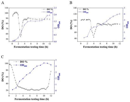 The effect of rotational speed on dissolved oxygen (DO) and optical density (OD) during fermentation at 0.571 VVm (2 lpm). A comparison of DO percentage and OD600 over the fermentation time at different rotational speeds with constant aeration of 0.571 VVm (2 lpm). (A) A total of 150 rpm; (B) 250 rpm; and (C) 350 rpm. The graphs demonstrate the relationship between DO levels (black dotted line, left y-axis) and biomass growth as measured by OD600 (blue solid line, right y-axis) over a 12 h fermentation period. Increasing the rotational speed shows distinct effects on both DO maintenance and growth patterns.