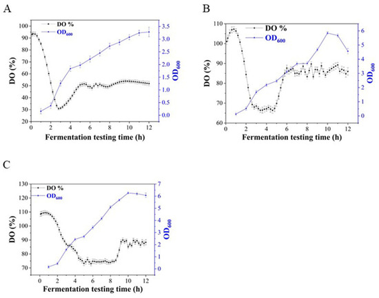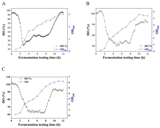 The effect of the rotational speed on DO and OD during fermentation at 1.714 VVm (6 lpm). A comparison of DO percentage and OD600 over the fermentation time at different rotational speeds with constant aeration of 1.714 VVm (6 lpm). (A) A total of 150 rpm; (B) 250 rpm; and (C) 350 rpm. The graphs demonstrate the relationship between DO levels (black dotted line, left y-axis) and biomass growth as measured by OD600 (blue solid line, right y-axis) over a 12 h fermentation period.