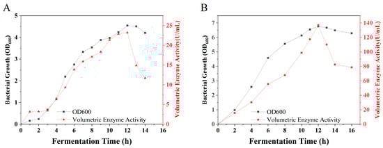 A method described by Zhang et al. [], including modifications, was used to ensure the optimal carbon source. Different carbon sources such as sucrose, glucose, lactose, soluble starch, and molasses (at a concentration of 10 g/L) were added to the initial fermentation medium (after the removal of glucose) and compared with each other. Other conditions were kept constant, and the effects of each carbon source on enzyme production and bacterial concentration were observed. Based on the experimental results, the carbon source with the most significant effect on the recombinant bacteria was selected, and the effect of this carbon source on enzyme production and bacterial concentration at different concentrations (2.5–12.5 g/L) was further investigated to determine the optimal carbon source concentration.