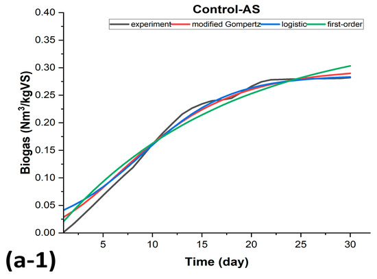 Modified Gompertz (Equation (2)), first-order (Equation (3)), and logistic (Equation (4)) models were developed to reflect a microorganism’s growth rate and are the most commonly used models for assessing the kinetics of CH4 production. The modified Gompertz equation is typically used to determine the decomposition of substrates of organic material [52].
