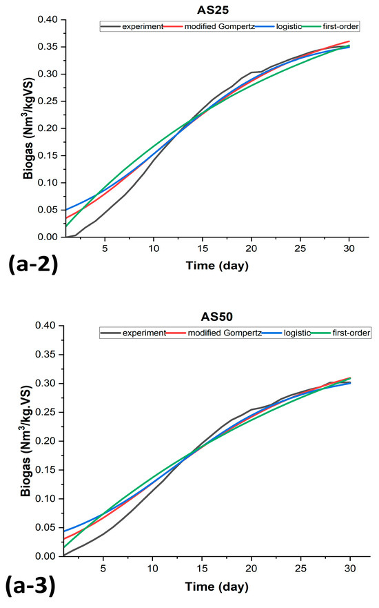 Considering the results of the three models, it can be concluded that the first-order model, followed by the modified Gompertz model, is the most accurate model for representing cumulative biogas production from co-digestion. The logistic model had the least accurate prediction of cumulative biogas production from co-digestion. Additionally, the first-order model proved to be the most effective at depicting the formation of mono-substrate digestion, as seen in Figure 7(a-1–b-4), for both control tests of AS and OFMSW. These results align with those in the literature [14,30,65,66,67] but contradict other studies that show the logistic model as being the best for representing production.