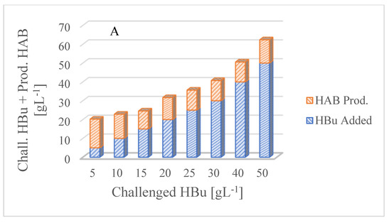 Acetic and butyric acids were measured with gas chromatography (GC; 6890N, Agilent Technologies, Wilmington, DE, USA). Analytical-grade standard acetic (Sigma Chemicals) and butyric (Sigma-Aldrich, St. Louis, MO, USA) acids were obtained from these companies. Details of their measurement have been published elsewhere [21,22]. Prior to injecting the samples to the GC, they were diluted by 20 fold using distilled water. Glucose was measured with HPLC (Thermo-Fisher Scientific, Pittsburgh, PA, USA). Experimental samples were diluted by 20 fold with distilled water, centrifuged for 20 min at 12,000 rpm using an Eppendorf 5417C centrifuge, and filtered through 0.20 µm filter (Cole-Parmer, Vernon Hills, IL, USA) before being injected into HPLC column (Bio-Rad 87P, 300 mm; Hercules, CA, USA). A Bio-Rad Micro-Guard De-Ashing cartridge and a Bio-Rad Micro-Guard Carbo-P cartridge were also used. The solvent used was MilliQ water at a flow rate of 0.6 mL∙min−1. The column temperature was maintained at 75 °C. Cell density was measured with a spectrophotometer (DU 800; Beckman Coulter). Before measuring optical density, the samples were diluted by 10–20 fold using a 9 g L−1 saline (NaCl; Sigma Chemicals) solution. Blank sample contained a 9 g L−1 saline solution. Cell concentration was determined using a graph plotted between optical density and cell dry weight concentration, and it is reported as dry weight in g L−1. The total acid productivity was defined as the total acid produced in g L−1 divided by fermentation time and is reported as g L−1 h−1. The specific productivity is defined as productivity divided by cell concentration. Acid and cell yields are reported as total acid or cell concentration divided by glucose used and are presented as g g−1. Although there may have been other chemicals present in the fermentation mixture that were below the detection limit of gas chromatography, glucose utilization material balance was performed using butyric and acetic acids as the final products. The results presented in this article are an average of two replications, with error margins of ±2 to 9%. The authors confirm that under the laboratory conditions mentioned in the Section 2, these results are reliable and the experiments are repeatable.