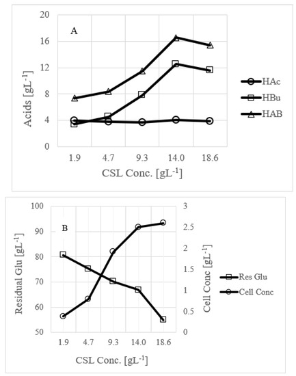 Effect of CSL on C. tyrobutyricum. (A) Production of acids at various CSL concentrations; (B) residual glucose and cell concentration; (C) productivities, specific productivities, acid yield, and cell yield.