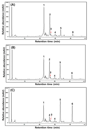 Typical HPLC chromatograms of isoflavones during the fermentation of isoflavone-enriched soybean leaves (IESLs) with the use of Lactiplantibacillus plantarum P1201 and/or Levilactobacillus brevis BMK184 as starters. Samples: The IESLs were fermented at 35 °C for 72 h, with the use of Lactiplantibacillus plantarum P1201 and/or Levilactobacillus brevis BMK184 as starters. (A) 0 h, (B) P1201 for 72 h, (C) BMK for 72 h, and (D) P1201 and BMK184 for 72 h. Chromatogram: 1, daidzin; 2, genistin; 3, malonyldidzin; 4, malonylgenistin; 5, dadzein; 6, genistein.