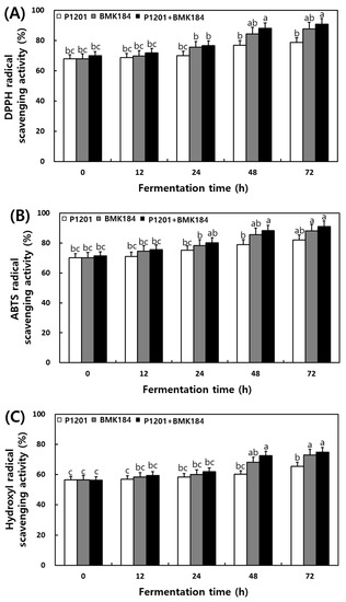 The changes observed in the antioxidant activities during the fermentation of IESLs are presented in Figure 2. The DPPH radical scavenging activity of soybean leaf fermentation was 67.98%, 67.88%, and 69.97% at 0 h of fermentation with the use of P1201, BMK184, and P1201 + BMK184 as starters, respectively; these activities were similar to those observed at the initial stage of the fermentation. Interestingly, it increased up to 90%; in particular, the BMK184 starter induced the highest activity (90.98%) in the fermentation products. The ABTS radical scavenging activity was 70.09–71.32% at 0 h of the fermentation. Notably, the highest content (91.09%) was shown in the fermented product after using P1201 + BMK184 as starters, at 72 h of fermentation. The hydroxyl radical scavenging activity was about 56% at the beginning of the fermentation (0 h), but the activity increased as the fermentation proceeded, and at the end of the fermentation (72 h), the P1201 (65.48%), BMK184 (72.96%), and BMK184 + P1201 (74.88%) starters showed the highest activity in that order. The FRAP was found to be within the range of 1.939 to 1.944 after 0 h of fermentation, and after 12 h fermentation, the FRAP was in the following order: P1201 < P1201 + BMK184 < BMK184. After 72 h of fermentation, the FRAP values obtained were 2.18, 2.39, and 2.45, with the use of P1201, BMK184, and P1201 + BMK184, respectively.