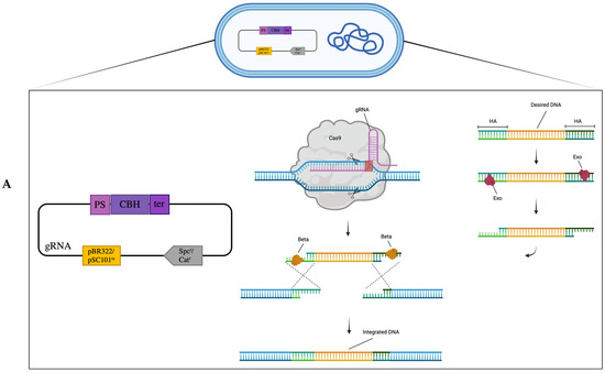Various genome engineering technologies were developed in early days based on (1) random mutagenesis via strain exposure to UV radiation or chemical mutagens followed by phenotype screening [6,7], (2) zinc-finger nuclease (ZFN) [8] and transcription activator-like effectors (TALEs) mutagenesis [9], (3) base editing [10] and prime editing [11], (4) genetic/genome recombination [12] and Multiplex automated genome engineering (MAGE) [13], (5) transposon mutagenesis [14], (6) phage transduction [15], and bacterial conjugation [16]. However, these traditional technologies are more limited to gene knockout and have various disadvantages, such as non-specific and non-reproducible mutations, hard-to-characterize mutations/mutants, labor-intensive and time-consuming protocols, etc. In early 21st century, technologies for site-specific genome engineering started to be developed, enabling targeted inactivation of endogenous genes in E. coli, and recombineering was one of them. Basically, recombineering relies on homologous recombination, which is mediated by phage recombinases such as RecET from Rac prophage or λRed proteins (i.e., Gam, Beta, Exo) [17], to integrate a double-stranded and single-stranded DNA fragment into the host genome [18]. In the λRed machinery, Gam prevents the degradation of the foreign DNA [19], Exo (lambda exonuclease) generates single-stranded 3′ overhangs, and Beta mediates annealing of homology arms to the complementary DNA target in the genome [20] (Figure 1A). Recombineering has been extensively applied to inactivate endogenous genes and a comprehensive E. coli mutant library containing the single mutations to all non-essential genes, i.e., Keio collection, was constructed [21], significantly facilitating derivation of E. coli gene-knockout mutants. On the other hand, recombineering has major technological drawbacks, such as low recombination efficiencies, especially upon integrating large DNA cargos, and requiring multi-step processes [4,13,22], limiting its primary application to gene knockout.