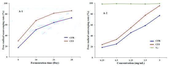 The stoichiometric analysis of DPPH radical bleaching was conducted, and the antioxidant activities of SSF-jujube with C. militaris after 28 days of fermentation are presented in Figure 1. The scavenging effect increased with the increasing fermentation time, and ranged approximately from 30.09% to 86.36%, and from 17.61% to 73.10% in the extracts of CFJ and CFR, respectively (Figure 1(A-1)). The solid-state ferments of the 28th day were collected and extracted using deionized water to detect the DPPH activity at different final concentrations (0.25, 0.5, 1.25, 2.5, and 5 mg/mL, respectively). As the results shown in Figure 1(A-2), all SSF samples showed a good scavenging effect against DPPH radicals in a dose-dependent manner at each concentration level. The scavenging ratios at 5 mg/mL, the highest test concentration of CFJ and CFR, were 95.17% and 77.17%, respectively. Furthermore, the DPPH activity of CFJ at 5 mg/mL was almost close to that of the positive control VC (≈98.59%). The water extracts of CFJ for DPPH radical scavenging effects were significantly higher than that of CFR, suggesting that the addition of jujube in the culture medium was helpful to improve the antioxidant activity of SSF-jujube with C. militaris.