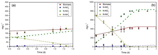 Regarding the isolated NOB kinetics, two different experiments (with and without ammonium–nitrogen addition) were conducted (Figure 3) in order to evaluate the different kinetic parameters for anabolism and catabolism. A slow biomass production rate was observed for both experiments (with and without ammonia) compared to the results that were exhibited in the literature [,].