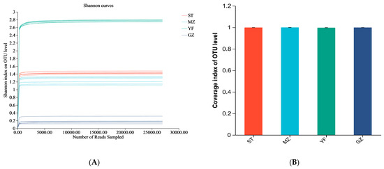 The genomic DNA of microbes was extracted from different samples, including the ST, MZ, YF, and GZ regions, using a DNA kit (Omega Biotek, Norcross, GA, USA) according to the manufacturer’s instructions. The integrity, concentration, and purity of the genomic DNA were determined using 1% agarose gel electrophoresis and a NanoDrop 2000 UV–vis spectrophotometer (Thermo Scientific, Wilmington, DE, USA). The primer pairs 515F (5′-GTGYCAGCMGCCGCGGTAA-3′) and 806R (5′-GGACTACNVGGGTWTCTAA-3′) were used to amplify the hypervariable region V3-V4 of the bacterial 16S rRNA gene via an ABI GeneAmp® 9700 PCR thermocycler (ABI, Los Angeles, CA, USA) [25]. The PCR amplification conditions were 95 °C for 3 min; 27 cycles of 95 °C for 30 s, 55 °C for 30 s and 72 °C for 10 min; and 72 °C for 10 min. The mixtures included 4 μL of buffer (5 × TransStart FastPfu), 2 μL of dNTPs (2.5 mM), 0.8 μL of primer (5 μM), 0.4 μL of DNA polymerase (TransStart FastPfu), 10 ng of genomic DNA, and ddH2O (20 μL). The amplified DNA was detected by 2% agarose gel electrophoresis followed by purification with an AxyPrep DNA Gel Extraction Kit (Axygen Biosciences, Union City, CA, USA) according to the manufacturer’s instructions.