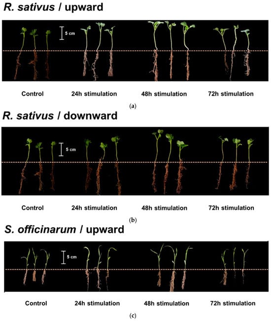 Comparison of shoot growth and root proliferation (R. sativus and S. officinarum) under various EMF application conditions (EMF upward (a,c) and EMF downward (b,d)). The dotted line indicates the growth measurement level. Data were obtained after 96 h of cultivation.