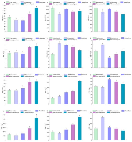 Changes in the activity of defense enzymes are one of the most important indicators of plant defense responses. Catalase (CAT), an antioxidant enzyme, serves as a biomarker of oxidative stress due to its ability to protect the structure and function of biomolecules []. Peroxidase (POD) has the dual role of eliminating the toxicity of hydrogen peroxide and facilitating the oxidation of phenols and amines []. Superoxide dismutase (SOD) plays a vital role in cellular protection, plant growth and development, and protection against adversity stress []. Phenylalanine deaminase (PAL) is an important class of immune resistance enzymes in plants []. In this study, we analyzed the effects of different insecticide treatments on the activities of antioxidant enzymes (CAT, POD, SOD, and PAL) in P. ostreatus to further elucidate the mechanisms by which P. ostreatus responds to abiotic stress and to provide a theoretical basis for its production.
