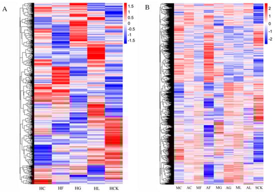 Heatmap for clustering differentially expressed genes in Pleurotus ostreatus. (A) Heatmap of differentially expressed genes clustered in mycelium; (B) heatmap of differentially expressed genes clustered in fruiting bodies.