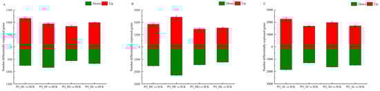 Number of differentially expressed genes in Pleurotus ostreatus. (A) Differentially expressed genes at the mycelial stage; (B) differentially expressed genes in the fruiting bodies after mixing treatment; (C) differentially expressed genes at the fruiting bodies after spraying treatment.