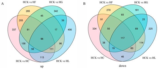 Venn diagram of differentially expressed genes in the mycelium of P. ostreatus. (A) The number of upregulated differentially expressed genes in the mycelia; (B) the number of downregulated differentially expressed genes in the mycelia.