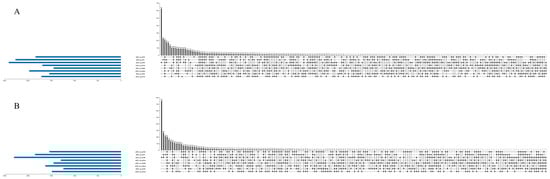 Upset plot of differentially expressed genes in P. ostreatus. (A) Number of upregulated differentially expressed genes in fruiting bodies; (B) number of downregulated differentially expressed genes in fruiting bodies.