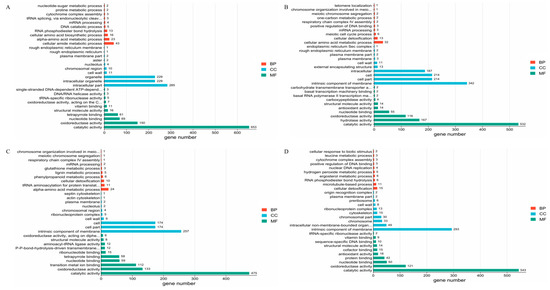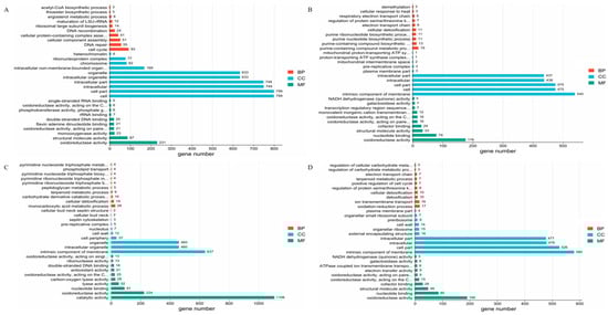 Gene Ontology enrichment results of DEGs in mycelia. (A) Gene Ontology (GO) enrichment analysis of PO_HC vs. CK; (B) GO enrichment analysis of PO_HF vs. CK; (C) GO enrichment analysis of PO_HG vs. CK; (D) GO enrichment analysis of PO_HL vs. CK. Legend: BP, biological process; CC, cellular component; MF, molecular function.