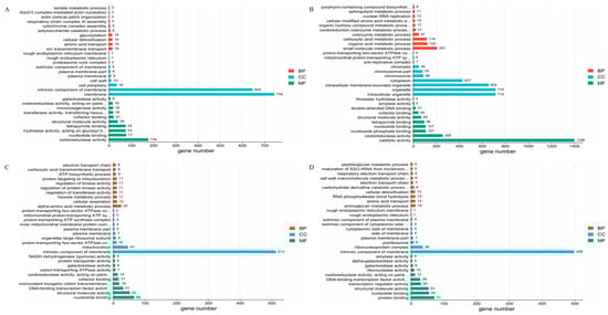 Gene Ontology enrichment results of DEGs in fruiting bodies under mixed treatment. (A) GO enrichment analysis of PO_MC vs. CK; (B) GO enrichment analysis of PO_MF vs. CK; (C) GO enrichment analysis of PO_MG vs. CK; (D) GO enrichment analysis of PO_ML vs. CK.