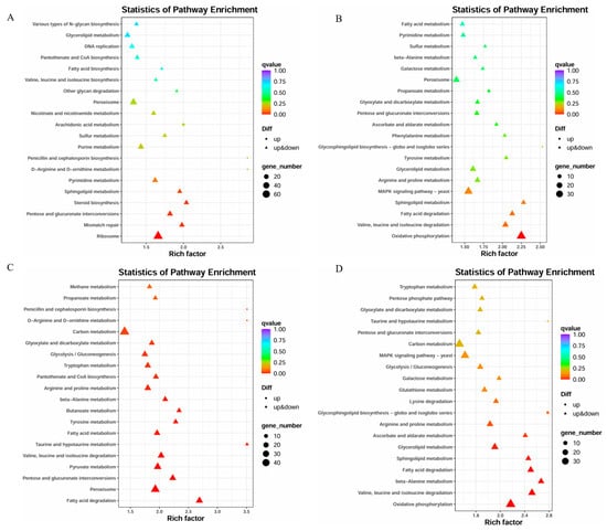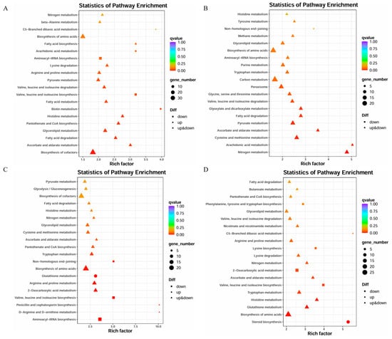 KEGG pathway enrichment of DEGs in fruiting bodies. (A) KEGG enrichment analysis of PO_AC vs. CK; (B) KEGG enrichment analysis of PO_AF vs. CK; (C) KEGG enrichment analysis of PO_AG vs. CK; (D) KEGG enrichment analysis of PO_AL vs. CK.