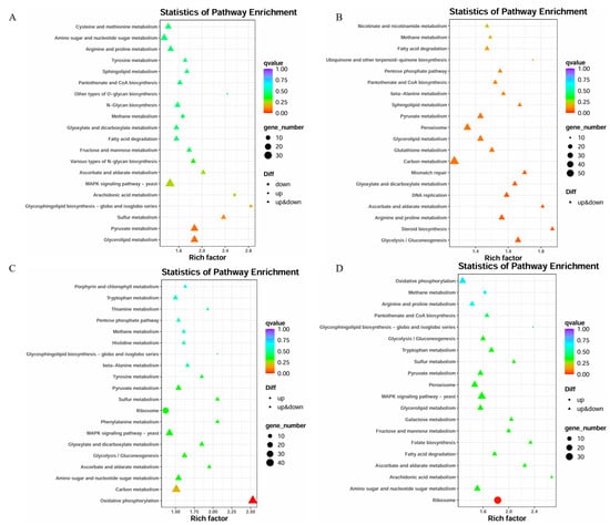 In PO_MC vs. CK comparison, 514 genes were annotated in 109 metabolic pathways (Figure 10A). The most significant pathways, in descending order of q-value, included glycerolipid metabolism, pyruvate metabolism, sulfur metabolism, glycosphingolipid metabolism, sulfur metabolism, glycosphingolipid biosynthesis, and MAPK signaling pathway—yeast.