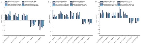 qRT-PCR validation of differentially expressed genes. (A) qPCR at the mycelium stage; (B) qPCR at the fruiting bodies of the mixed substrates; (C) qPCR at the sprayed fruiting bodies.
