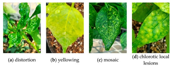 Symptoms of TSWV infection in peppers vary widely and include vein clearing, leaf curling, mosaic patterns, chlorosis, stem necrosis, and ring spots. The severity and manifestation of these symptoms differ among individual plants, depending on the type of plant and its growth stage [22]. Other viruses, such as cucumber mosaic virus (CMV), can also cause similar symptoms, complicating the diagnosis of TSWV based solely on visual observations. This study aims to tackle these diagnostic challenges using image-based machine-learning techniques to determine TSWV infection status. There is a need to reduce reliance on subjective human judgment and to adopt more objective and accurate evaluation methods.
