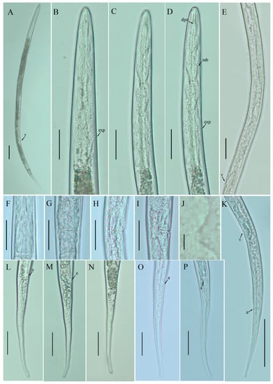 Photomicrographs of Basiria bhabi female. (A) Entire body; (B–D) pharyngeal regions; (E) entire gonad; (F) basal pharyngeal bulb; (G) vulval region (ventral view); (H,I) vulval region (lateral view); (J) lateral lines; (K) posterior body to tail terminus; (L–O) tail regions (lateral view); (P) tail region (ventral view). Scale bars: (A,K) 50 µm; (B–I,L–P) 20 µm; (J) 5 µm. Arrowheads: (a) anus; (DGO) dorsal pharyngeal gland orifice; (exp) excretory pore; (mb) median bulb; (v) vulva.