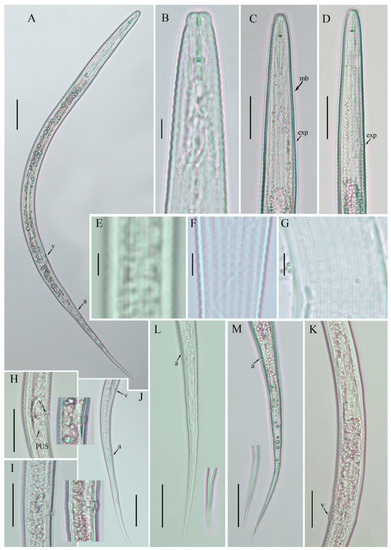 Photomicrographs of Coslenchus acceptus female. (A) Entire body; (B) lip region; (C,D) pharyngeal regions; (E) lateral lines; (F,G) cuticular ridges; (H,I) vulval region; (J) posterior body to tail terminus; (K) entire gonad; (L,M) tail region. Scale bars: (A,J) 50 µm; (C,D; H,I; K–M) 20 µm; (B,E–G) 5 µm. Arrowheads: (a) anus; (exp) excretory pore; (mb) median bulb; (PUS) post-vulval uterine sac; (v) vulva.