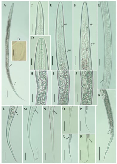 Photomicrographs of Filenchus vulgaris female. (A) Entire body; (B) lateral lines; (C,D) lip regions; (E,F) pharyngeal regions; (G) entire gonad; (H–J) vulval regions; (K) posterior body till tail terminus; (L–R) tail regions. Scale bars: (A,K,O–R) 50 µm; (C,E–J,L–N) 20 µm; (B,D) 5 µm. Arrowheads: (a) anus; (exp) excretory pore; (mb) median bulb; (v) vulva.