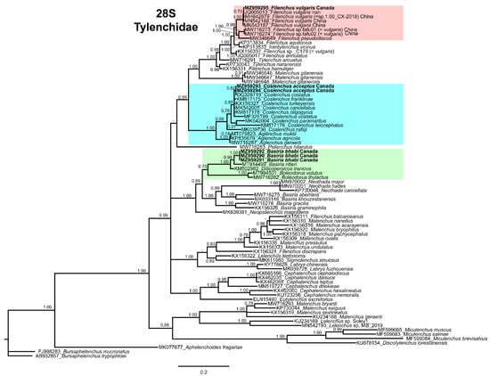 Phylogenetic relationships of Basiria bhabi, Coslenchus acceptus, and Filenchus vulgaris within Tylenchidae. Bayesian 50% majority rule consensus tree as inferred from D2–D3 expansion domains of the 28S rRNA sequence alignment under the transition model with invariable sites and a gamma-shaped distribution (TIM2 + I + G). Posterior probabilities of greater than 0.70 are given for appropriate clades. Sequences produced in this study are shown in bold, and colored boxes indicate the clade association of each species detected in this study.