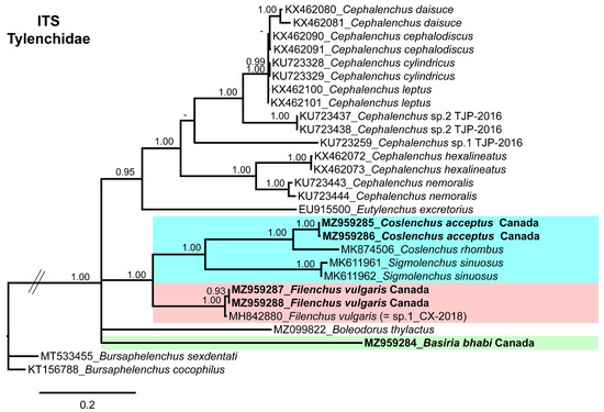 Phylogenetic relationships of Basiria bhabi, Coslenchus acceptus, and Filenchus vulgaris within Tylenchidae. Bayesian 50% majority rule consensus tree as inferred from the ITS1 rRNA sequence alignment under the general time-reversible model and a gamma-shaped distribution (GTR + G). Posterior probabilities of more than 0.70 are given for appropriate clades. Sequences produced in this study are shown in bold, and colored boxes indicate clade association of each species detected in this study.
