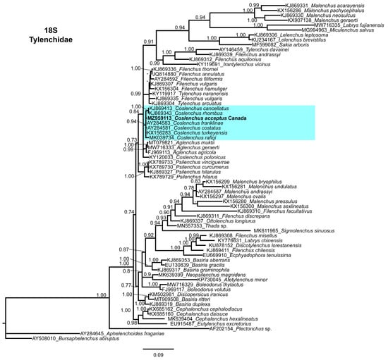 An 18S tree was constructed with the single sequence of C. acceptus and related Tylenchidae species sequences (Figure 6). As with the 28S and ITS trees, C. acceptus grouped within the Coslenchus clade. The sequence identity of C. acceptus with the Coslenchus clade species was 99%, with 4–9 nucleotide differences and 0–1% indels.