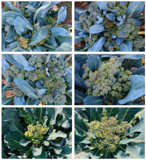 Recent results [76] showed that higher than normal temperatures affected all the parameters of broccoli plants grown under field conditions (such as the plant height, plant leaf number and weight, stem length and weight, head diameter, weight and quality), except the number of lateral shoots. In summary, growing three F1 hybrids (Cigno, Principe and Domino) in periods with higher (by 4.7–4.8 °C) than normal temperatures resulted in an increase in the plant’s leaf number, a decrease in the head diameter, an increased amount of water for the irrigation and extended period from the beginning to the end of the harvest in all three genotypes (Figure 1), while, in addition, it modified the head weight and quality, marketable head weight, marketable crop yield, non-marketable production, loss of leaves and the number of days from planting to harvest (Figure 1 and Table 2), but in a diverse way in the three genotypes. Higher than normal temperatures caused a wide range of changes in the head’s characteristics that degrade its quality (Figure 2).