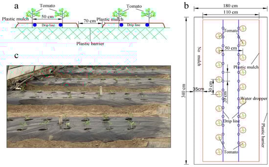 The tomato variety “Mingzhu” (Danjiangkou Kaixin Seed Industry Co., Ltd., Danjiangkou, China) is a tomato hybrid with a pink, hard, and round fruit that matures early and shows indeterminate growth. Each plot (3.4 m × 1.8 m) contained a raised ridge (1.1 m in width) with walkways (0.7 m) in between adjacent plots. To prevent the horizontal infiltration and movement of soil moisture, a 1.0 m-deep plastic film was buried in the walkways. Two drip irrigation tubes were installed on each ridge with a nozzle spacing of 20 cm. Tomatoes were planted on a ridge with a row spacing of 50 cm and a plant spacing of 30 cm (Figure 1). A small weather station (FT-QC8, Shandong Wanxiang Technology Co., Ltd., Weifang, China) was installed in the middle of the greenhouse, which could automatically record temperature, relative humidity and photoactive radiation every 30 min. The average temperature, daily photosynthetically active radiation and relative humidity of the greenhouse during the growing season were 24.76 (2020) and 24.02 ℃ (2021), 19.72 (2020) and 18.23 (2021) mol∙m−2∙d−1, and 62.32 (2020) and 68.71% (2021), respectively.