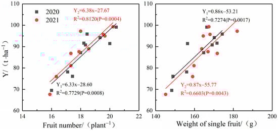Correlation between yield (Y, t·ha−1), number of fruits (plant−1), and the weight of a single fruit (g) with different urea types and N application rates in the greenhouse. The black line and square dots indicate the result for 2020, the red line and round dot indicate the result for 2021. Y1 and Y2 represent estimated yield of greenhouse tomato in 2020 and 2021, respectively.