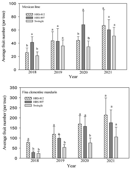 Total average fruit number (2018–2021) of ‘Mexican’ lime, ‘Fina’ clementine mandarin, and ‘Campbell’ Valencia orange grafted in three different rootstocks growing in Coto series soil at the Agricultural Experiment Substation of Isabela, Puerto Rico. Means ± standard error with different letters for each scion and year are not significantly different according to Tukey’s test at α < 0.05.