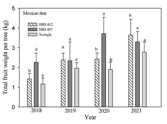 Total fruit weight in kg per tree (2018–2021) of ‘Mexican’ lime, ‘Fina’ clementine mandarin, and ‘Campbell’ Valencia orange grafted in three different rootstocks growing in Coto series soil at the Agricultural Experiment Substation of Isabela, Puerto Rico. Means ± standard error with different letters for each scion and year are not significantly different according to Tukey’s test at α < 0.05.