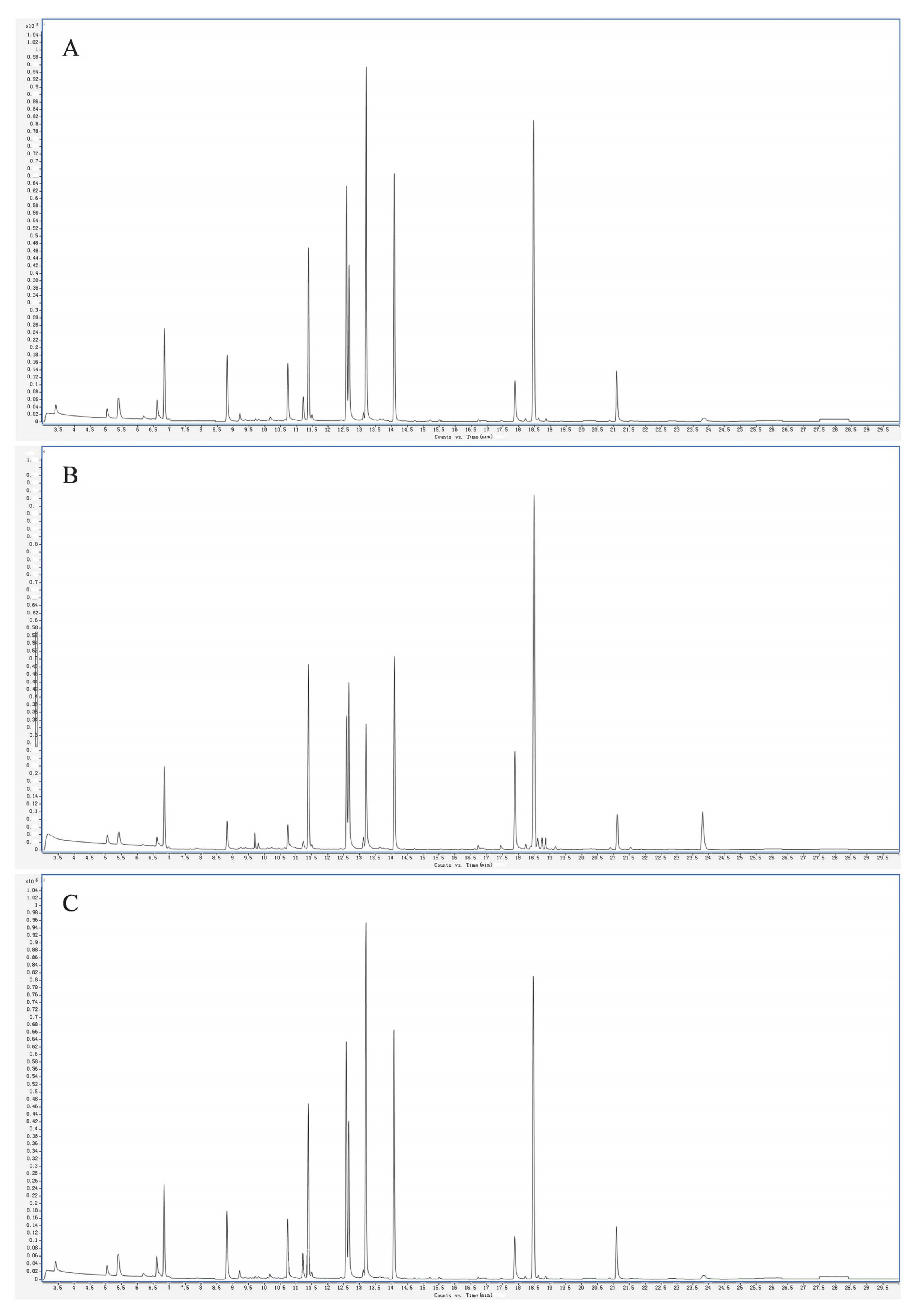 | Terpenoids | 34.889 ± 0.077 b | 38.312 ± 0.148 a | 34.985 ± 0.052 b |