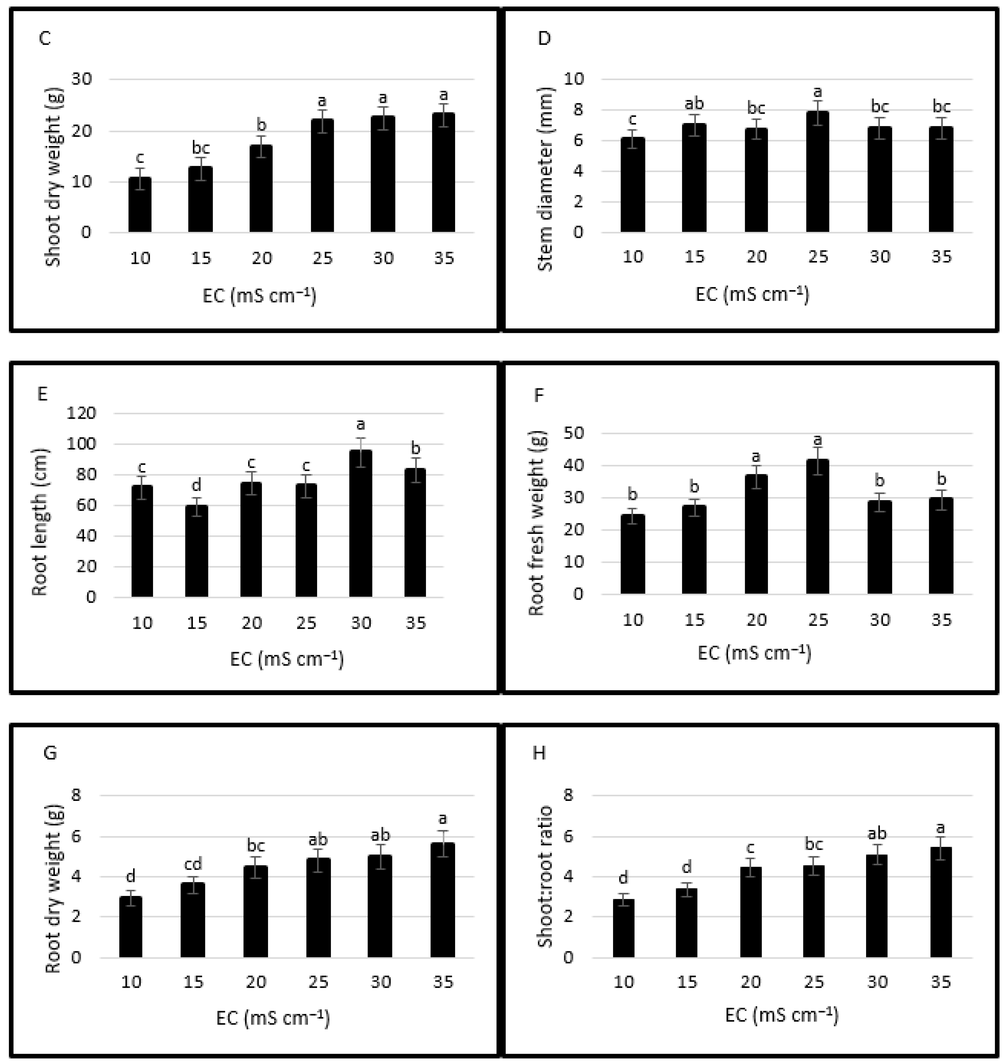 Shoot fresh weights were the lowest at EC levels of 10 and 15 mS cm−1. Shoot fresh weight at 25 mS cm−1 was higher at 145.4, 90.1, 9.9, 22.3 and 8.5% than at 10, 15, 20, 30 and 35 mS cm−1, respectively (Figure 3B). Shoot dry weight was higher at 25, 30 and 35 mS cm−1 compared to the lower EC levels (Figure 3C). Stem diameter changed between 6.1 mm (the lowest in 10 mS cm−1) and 7.85 mm (the highest in 25 mS cm−1) (Figure 3D).