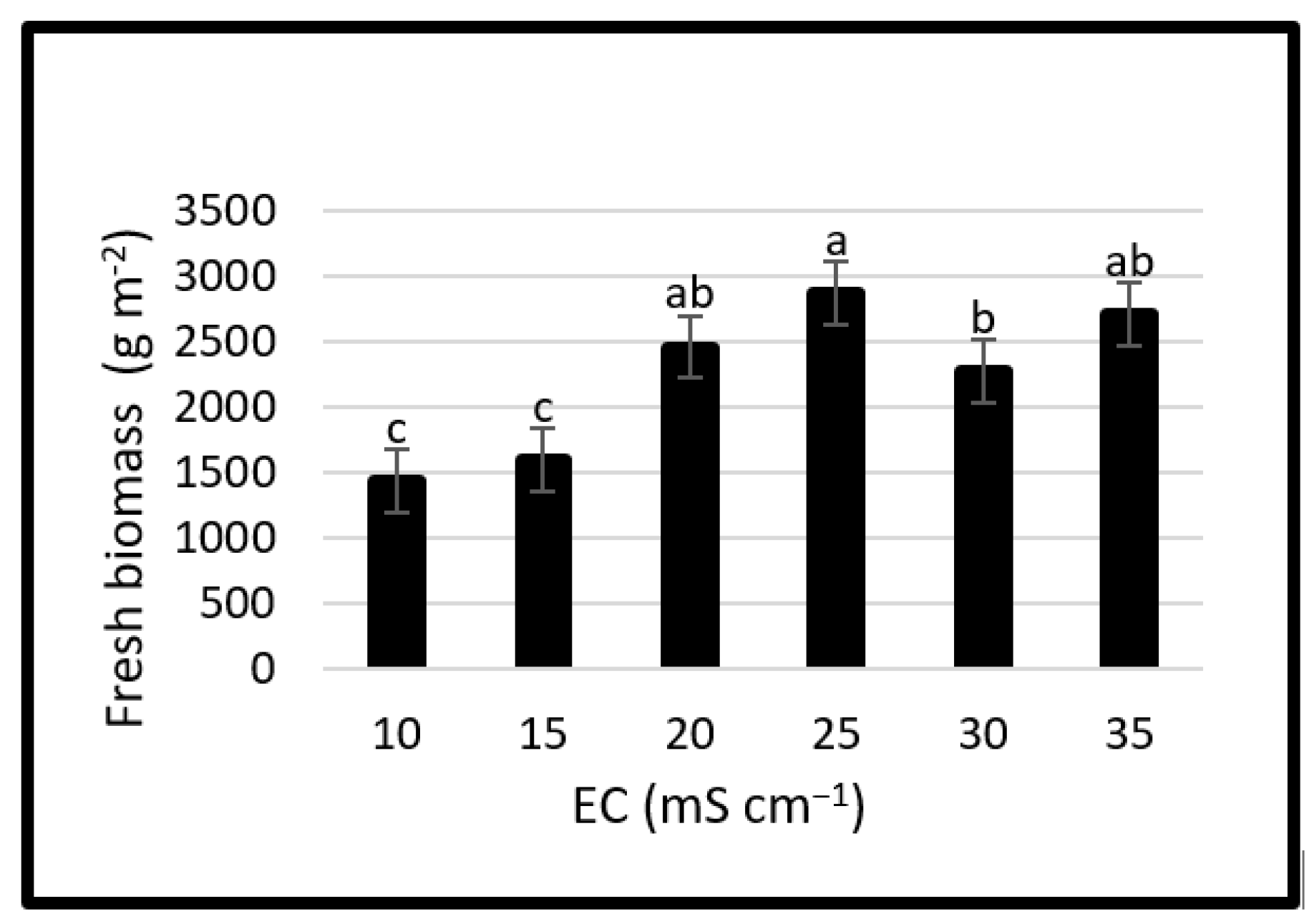 The effects of different EC levels of nutrient solution on measured fresh biomass were observed to be significant. The highest fresh biomass was 2864.06 g m−2 at the EC level of 25 mS cm−1 and followed by 2703.56 and 2457.15 g m−2 at 35 and 20 mS cm−1, respectively. The yield was 100.5 and 80% higher at 25 mS cm−1 compared to 10 and 15 mS cm−1, respectively (Figure 4). It was 16.6, 26.3 and 5.9% higher at 25 mS cm−1 than at 20, 30 and 35 mS cm−1, respectively.