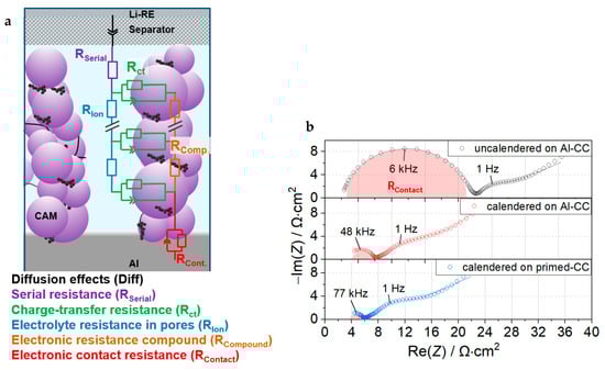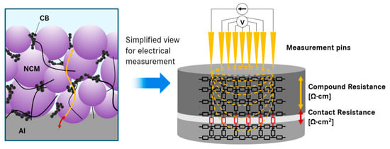 Typically, the cathode active material (CAM) is mixed with carbonaceous conducting additives in electrode preparation to reduce the electronic resistance. However, the conductive additive itself counts as inactive material in the electrode and should therefore be minimized to achieve sufficient energy density []. Various studies have been performed, highlighting the impact of type (structure, dimensionality, aspect ratio, percolation properties) and amount of conductive additive in LIB cathodes [,,,]. Other studies have emphasized a strong dependence of the electronic resistance on the connection between the electrode compound and current collector [,,]. These findings indicate that the electronic resistance of cathodes must depend on two very specific contributions. The first is the resistance between the current collector (CC) and electrode compound, denoted herein as RContact, whereas the second is the electronic resistance within the electrode compound itself, denoted herein as RCompound.