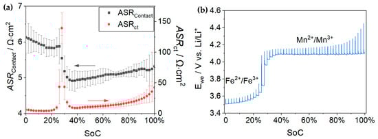 The large overpotential in this area is assumed to be caused by a solid solution reaction regime between the Fe2+/Fe3+ and Mn2+/Mn3+ redox reactions, which can lead to a sluggish Li+ diffusivity within the crystal [,]. In parallel, the voltage profile shows a step increase in cell voltage. As the Mn2+/Mn3+ redox reaction takes over completely, Rct drops back to a local minimum value around 35% to 40% SoC, which is in agreement with the beginning of the Mn2+/Mn3+ voltage plateau. Afterward, Rct starts to steadily increase for SoC > 40%, a behavior that can be attributed to Li+ transport hindrance due to lattice distortion caused by the Jahn–Teller active Mn3+ []. In contrast to Rct, the RContact shows just minor dependence on the SoC point, which was expectable. These differences in the SoC dependencies of Rct and RContact are a further validation of our allocations of resistance contributions in LMFP. We also observed a characteristic behavior that has not been described before: the RContact of the Fe2+/Fe3+ redox region is slightly higher compared to the RContact of the Mn2+/Mn3+ redox region. A possible explanation for this behavior might be a change in the electronic resistance of the LMFP. Explanations are discussed in more detail in Section S5 in the Supplementary Information. Furthermore, the pulses shown in Figure 2b were used to calculate resistances; the results are compared with EIS results and shown in Supplementary Information Section S6.