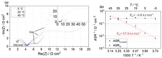 For an in-depth analysis, the temperature-dependent EIS data were fitted and afterward plotted according to Arrhenius law, as shown in Figure 3b. The activation energy of the different processes was calculated from the slope of the linearized fit of data points. RContact and Rct exhibited activation energies of −0.8 kJ∙mol−1 (−0.01 eV) and 57.9 kJ∙mol−1 (0.60 eV), respectively. The found negative activation energy value for RContact is slightly deviating from the values reported in the literature for other CAMs, which are typically 1–4 kJ∙mol−1 [,,]. However, both values are close to zero and are therefore indicating a low dependence of RContact on temperature. As RContact involves electron transfer from the Al-CC to the cathode coating, it should also be noted that the electronic resistance of the Al is increasing with increasing temperature (temperature coefficient of ~0.004 K−1) [] (p. 602). The part of Al conduction in the RContact may therefore be a reason for the negative activation energy.