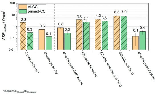 Figure 4 shows a comparison of RContact values determined using different measurement methods (2-point probe, 46-point probe, EIS study) for calendered LMFP cathodes (porosity: 50%) coated on a CC. Different stages of cell preparation were taken into consideration when analyzing data obtained using the 2-point probe (dry electrode), 46-point probe (dry electrode and DMC-wetted electrode) and EIS measurements (electrolyte-wetted electrode in cell). Please note that for the two-point probe, the results include RContact and RCompound, as they are not separable with this method (but as shown below, RCompound is assumed to be comparably low in these samples). The methods are compared for the LMFP electrode coating (porosity: 50%) on an Al-CC as well as for the LMFP electrode coating (porosity: 50%) on a primed-CC. In this way, we can not only compare the absolute values of each measurement, but also analyze if the relationship between data points for the two electrode types differs based on the method applied.