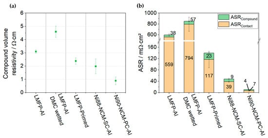 Figure 6a shows the results of the 46-point probe measurement for different combinations of cathode active materials (LMPF, Ni88-NCM-SC, Ni90-NCM-PC) and current collectors. The values for RCompound are plotted in the unit of resistivity (Ω·cm). The compound resistivity RCompound of the LMFP cathode coating on an Al-CC increased after DMC wetting from 3.1 Ω·cm to 4.6 Ω·cm. As the compound itself is the same for the LMFP cathode on an Al-CC and primed-CC (porosity of coating for both: 50%), it seems rational to assume that the compound resistance is identical. However, the measurement yields a somewhat lower resistivity for the coating on a primed-CC, with RCompound being 2.4 Ω·cm. The results measured for Ni88-NCM-SC (2.0 Ω·cm) and Ni90-NCM-PC (1.0 Ω·cm) are provided as reference and for comparison.